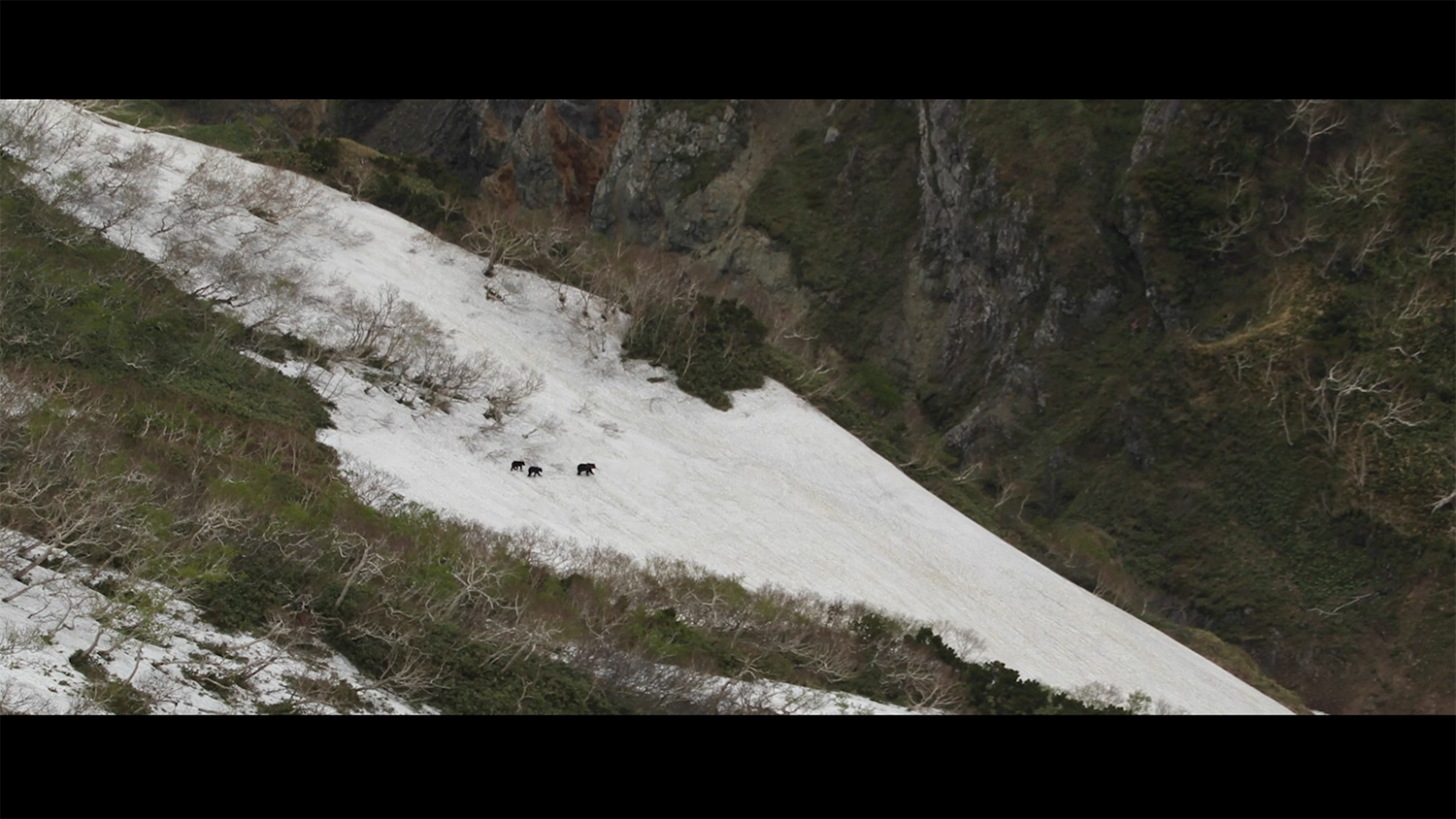 5月初旬、冬眠明けのヒグマ親子が雪渓を歩くシーンです。